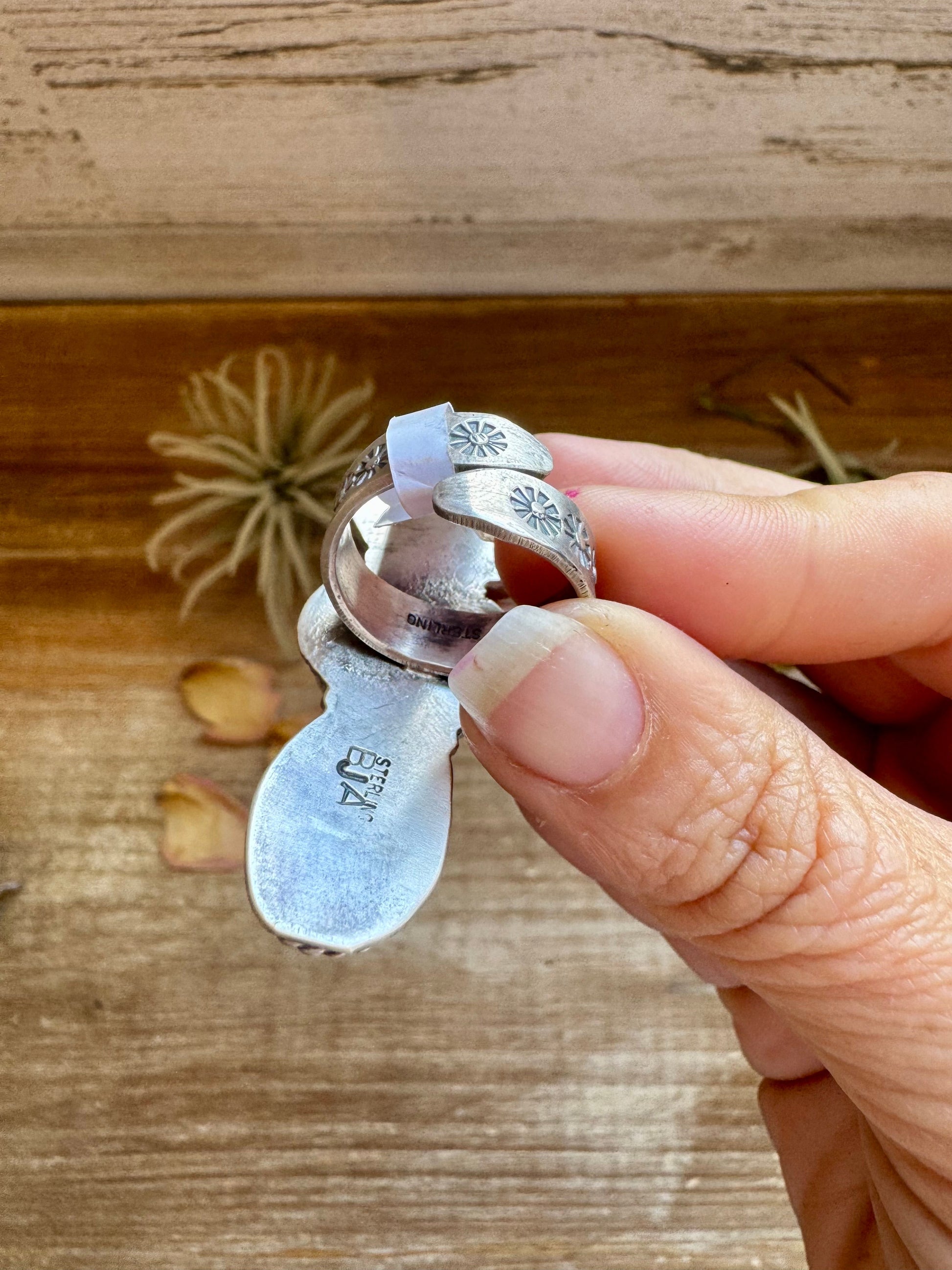 This adjustable sterling silver ring features three green turquoise stones set in a beautiful design by Navajo artist Boyd Ashley. Stamped BJA on the back, this ring is native made, handcrafted with incredible detail and natural stones.