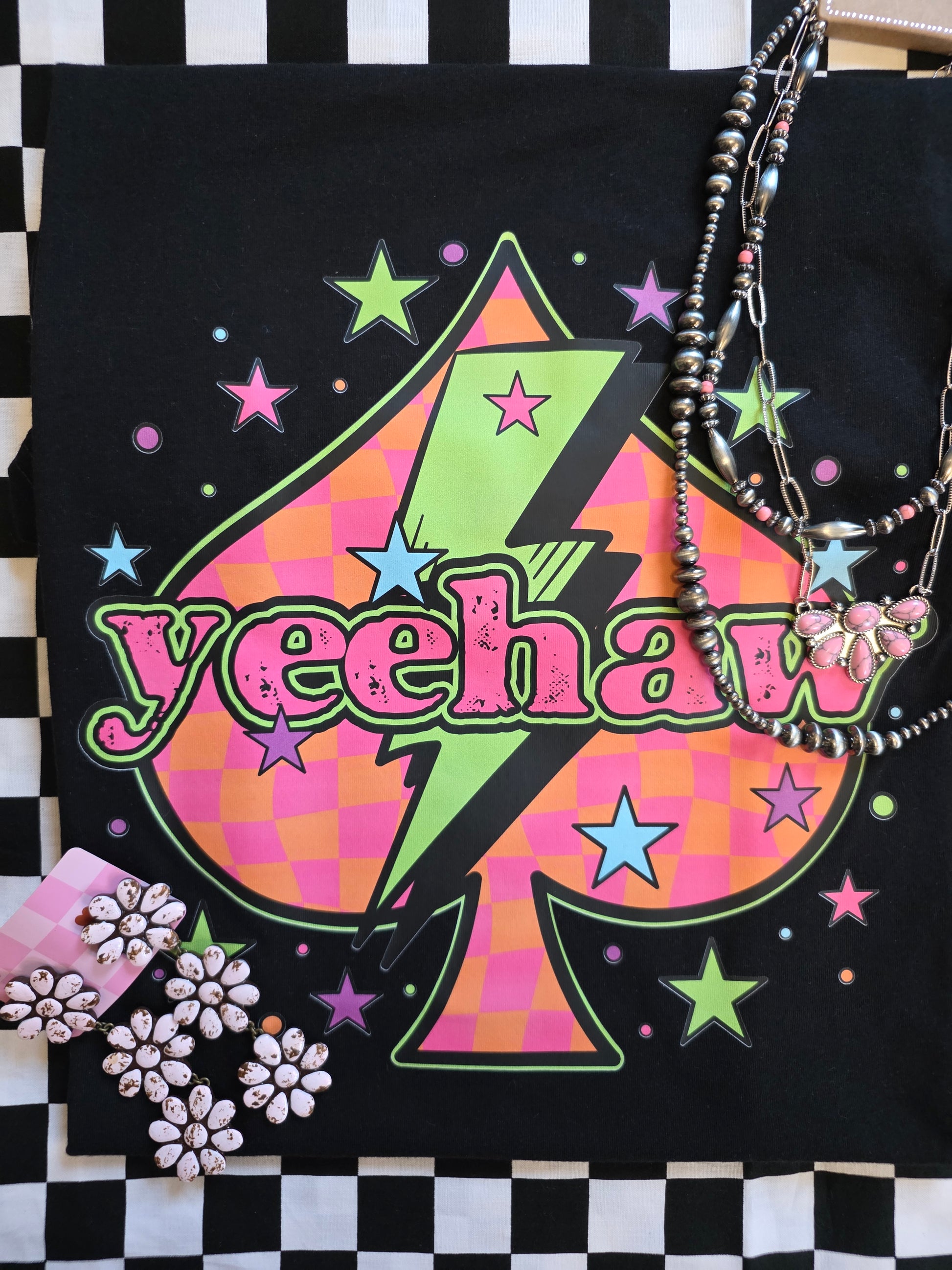 The YEEHAW t-shirt is crafted from 100% cotton using Bella Canvas, ensuring breathability and comfort. Its unisex design features a crew neckline and short sleeves, providing a true-to-size fit suitable for a variety of body types. The direct-to-film (DTF) transfer enhances durability and print quality.